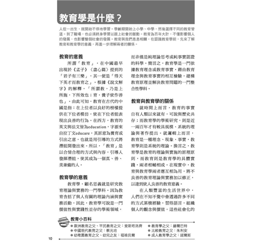 教育是讓人了解自己和群體、培養生存能力並啟發潛能、追求自我實現的重要途徑,也是人類文明進步的力量。「教育學」就是為了實踐教育理念、建構原理並解決問題而生,整合行政學、哲學、心理學、社會學等學科的知識體系。
