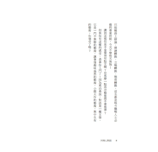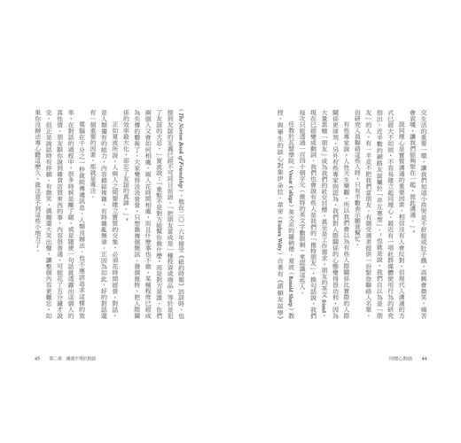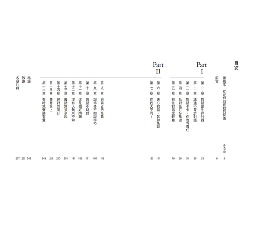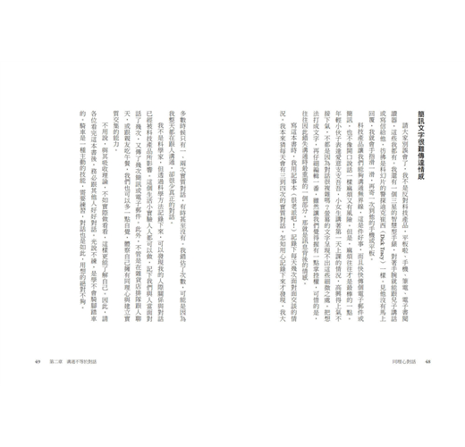 在這本書中,瑟列斯特.赫莉提供實用的對話策略,包括專注、真誠、傾聽能力、同理心、發問技巧、拋開成見等等。不管碰到躲不掉的對話(例如老闆沒有重點的跟你話家常),或是重要的對話(例如面試),都能成功應對。