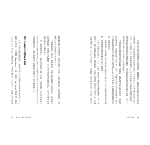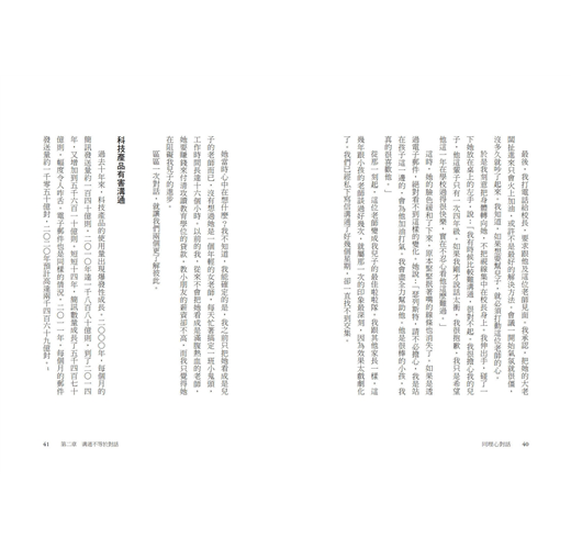 她發現,成功的對話就像拋接球,一下子講自己的想法,一下子專心聽對方說什麼。不過一般人在對話的時候,卻常常犯了對話自戀症,只想講自己的經驗,卻忘記傾聽對方的心聲。