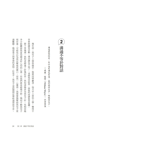 在這個大家有對話障礙、彼此缺乏溝通的年代,本書是不可不讀的好書。我從本書受益匪淺,學到了建立交集、專注當下、傾聽對方的方法。作者說故事的能力一流,筆觸真誠。拜她的建議之賜,身為記者與老師的我,工作的洞察力提升,但更重要的是,我也變成更好的妻子、朋友、媽媽。
