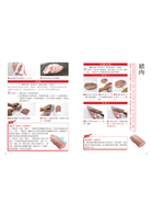 以豬肉為例,豬肉最需切斷肉筋的部分為里肌肉和里肌肉排。豬肉的外圍有一圈白色的筋膜,利用書中圖示,使用菜刀將肉筋剁斷,整圈的豬肉大約剁3~5刀即可完成。