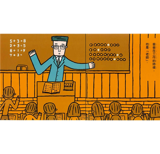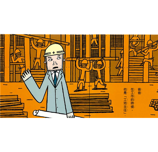 ● 利用左右頁的配置,將文字呈現在右頁,圖像於左頁呈現,先讓讀者看到爸爸平凡、居家的樣子,翻頁後,再看到工作中的爸爸,專業又認真的面貌。