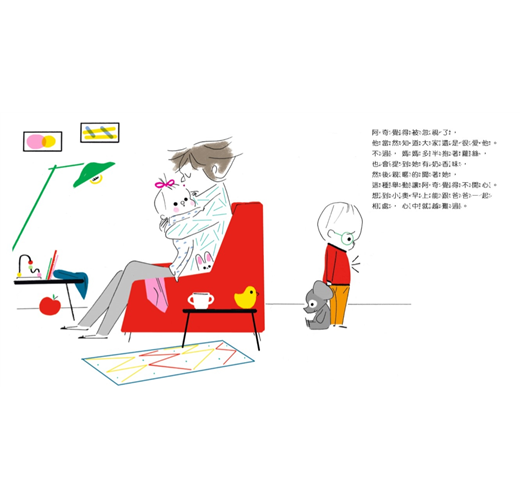 阿奇的家有爸爸、媽媽、哥哥小奧和阿奇四位成員,最近又多了一個小寶寶,