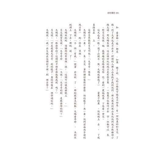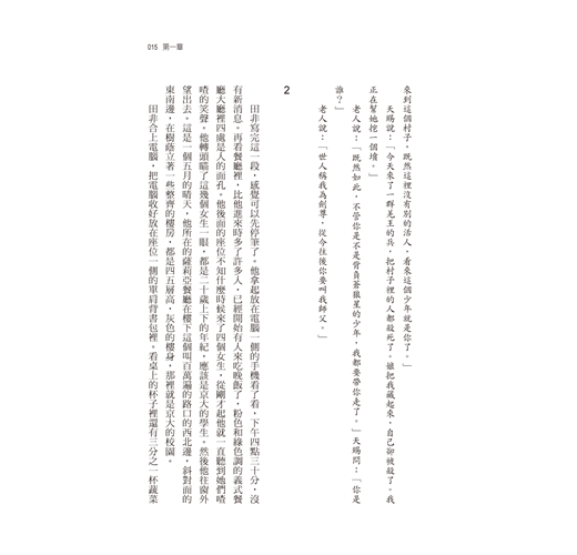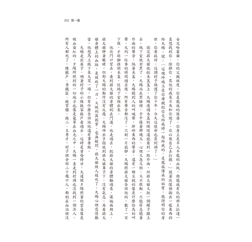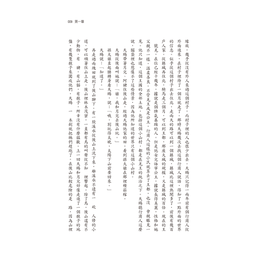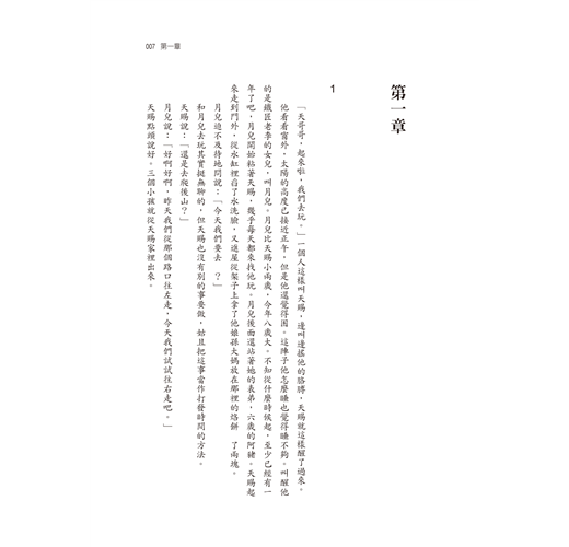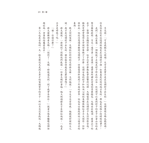 他看看窗外,太陽的高度已接近正午,但是他還覺得困。這陣子他怎麼睡也覺得睡不夠。叫醒他的是鐵匠老李的女兒,叫月兒。月兒比天賜小兩歲,今年八歲大。不知從什麼時候起,至少已經有一年了吧,月兒開始粘著天賜,幾乎每天都來找他玩。月兒後面還站著她的表弟,六歲的阿豬。天賜起來走到門外,從水缸裡舀了水洗臉,又進屋從架子上拿了他娘孫大媽放在那裡的烙餅吃了兩塊。