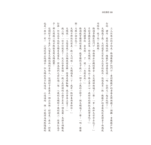 錢二說:「你不信就算了,反正你會後悔。」錢二在村裡的小孩中算是一個惡霸,見誰不順眼就打誰,但這兩年他對天賜算是客氣,因為他們之前打過一架,八歲的天賜對十歲的錢二,結果打成平手,那之後錢二就不敢輕易對天賜挑釁。