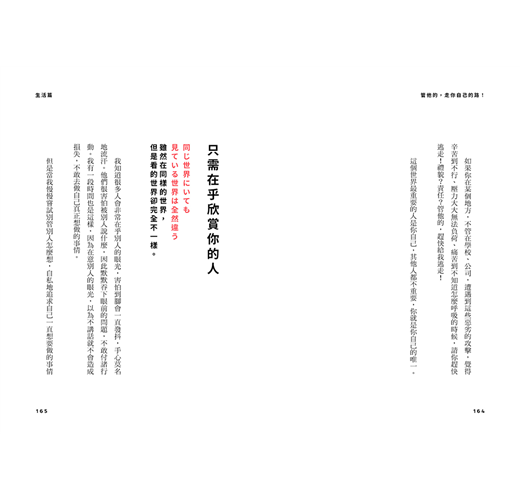 但是當我慢慢嘗試別管別人怎麼想,自私地追求自己一直想要做的事情後發現,真的不需要去在乎別人的眼光。因為不管你做什麼,一定會有兩派說法,有人支持地說好,也有人會批評說不好。