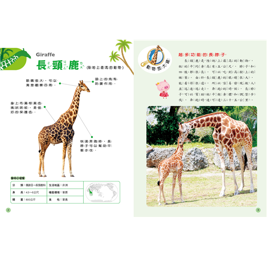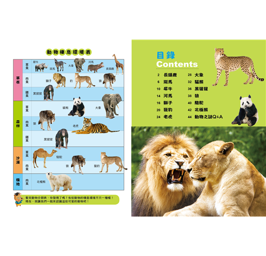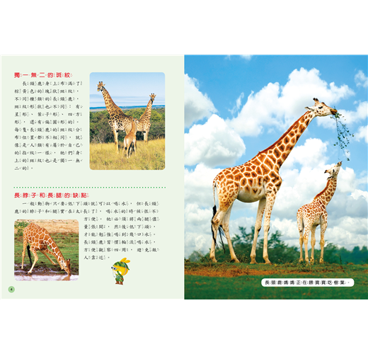 4.生動的圖片,真實呈現動物的生活,輔以精采的文字說明,提升閱讀興趣,增加動物相關知識。