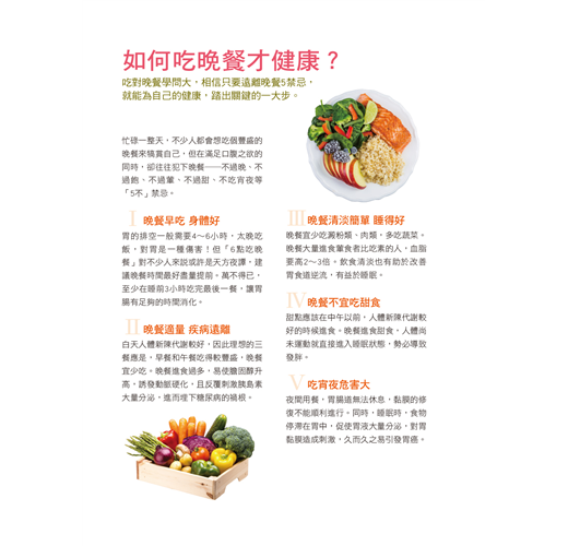 忙碌一整天,不少人都會想吃個豐盛的晚餐來犒賞自己,但在滿足口腹之欲的同時,卻往往犯下晚餐過晚、過飽、過葷、過甜、吃宵夜等禁忌。