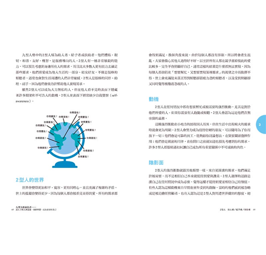 九型人格也是一種幫助我們理解他人的工具。透過這本書,你會學到身邊人們看待世界的九種不同方式。它會提醒你不是每個人的思考方式都跟你相同。某人表現出跟你類似的特徵或反應,不代表他們也是因為同樣的理由才那麼做。