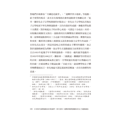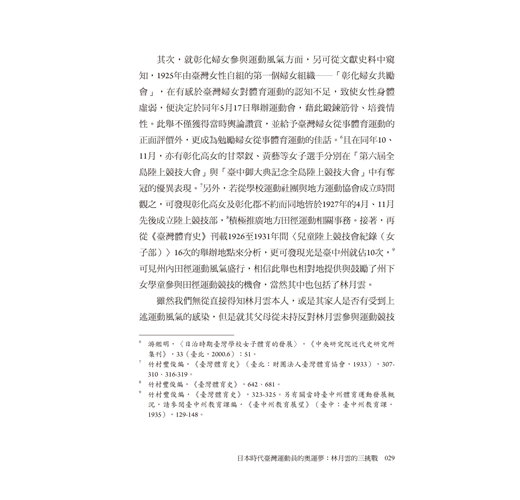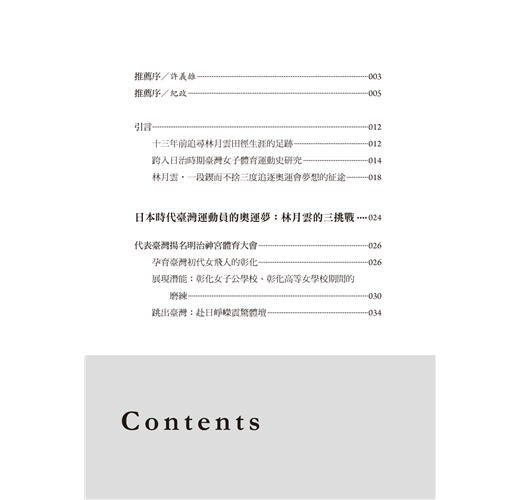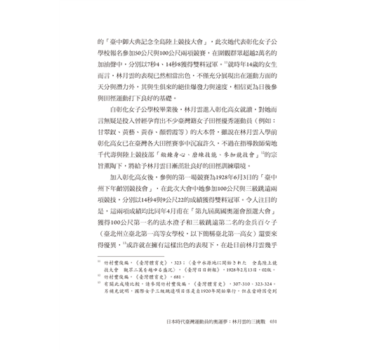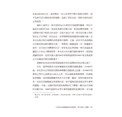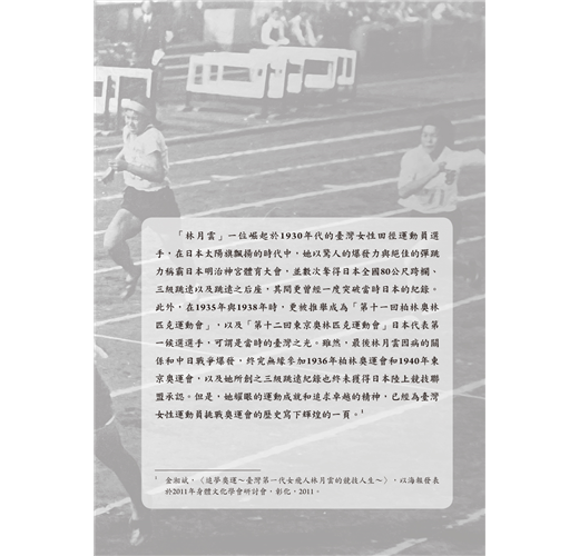 金湘斌被林月雲三度追逐奧運會夢想的過程所深深吸引,甚至因此解鎖了新的研究天地——「臺灣女子體育運動史」。在林月雲對奧運會選拔的三挑戰以外,本書附篇〈纏足到競技〉則梳理臺灣女性擺脫長久以來纏足對身體的束縛、參與運動競技的時代背景,深入淺出地呈現臺灣女子體育運動史;由此,讀者方能清楚瞭解林月雲代表臺灣名揚日本明治神宮體育大會和三度試圖挑戰登上奧運會舞台的不易。同時,本書亦收錄百餘張珍貴歷史相片,令人仿若穿越時空、親歷田徑場,目睹林月雲以及同時代運動員的颯爽英姿。