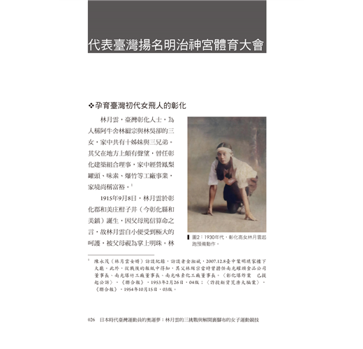 林月雲,1915年9月8日出生,臺灣彰化和美人,先後就讀彰化女子公學校(今彰化縣民生國小)、臺中州立彰化高等女學校(今國立彰化女中)、日本女子體育專門學校(今日本女子體育大學)。身為臺灣初代「女飛人」的她,於1931年9月的「第十二屆全島陸上競技大會」中,表現一鳴驚人,被膺選成為第一位代表臺灣參賽明治神宮體育大會的「正港」臺灣本土女子運動員,並以驚人的爆發力與絕佳的彈跳力揚名明治神宮體育大會、聲名大噪,更在日本內地舉辦的各賽事中,多次登上80公尺跨欄、三級跳遠、跳遠等項目的后座,甚至曾經一度突破當時的日本紀錄!1932、1936、1940年,林月雲三次參與奧運會選拔,雖然三次皆因各種原因功敗垂成,未能達成「光耀臺灣」的理想,只能收起釘鞋、裝備,轉身漸漸淡出熟悉的田徑跑道,但她的追求無疑已為日後臺灣女子運動員擘畫出努力的方向與目標,當然亦為日後挑戰參加奧運會樹立起標竿和典範的作用。