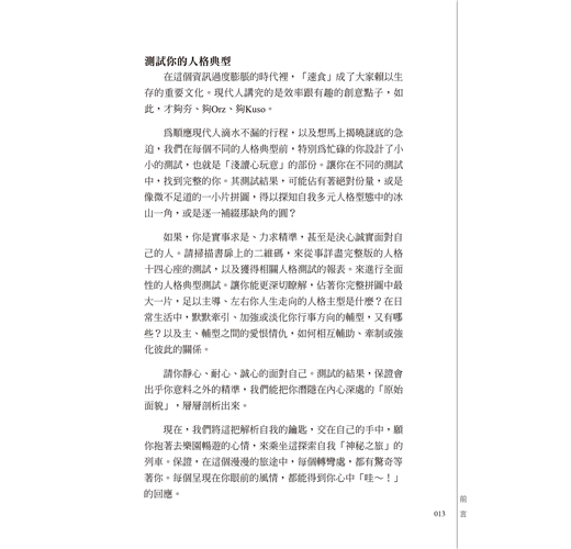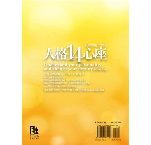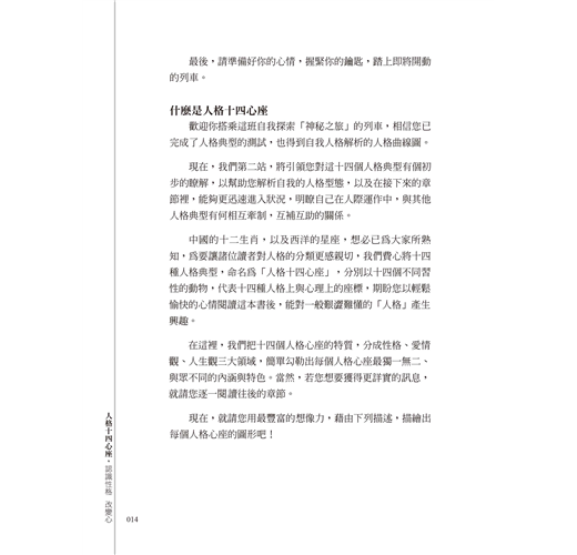你可以藉由本書裡的小測試,以及詳盡的解說內容,與自己的內心誠實地對談,檢視過往的信念、行為模式,如何牽引、建構自己的人生,發掘自己過去未曾覺察的才能與優點,或是存在已久的 「絆腳石」。或是請掃描書扉上的二維碼,來從事詳盡完整版的人格十四心座測試,以及獲得相關人格測試的報表。