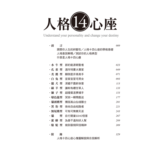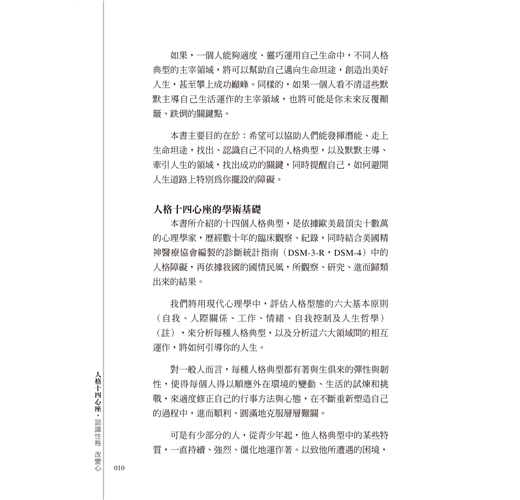 本書所介紹的十四個人格典型,是依據歐美最頂尖十數萬的心理學家,歷經數十年的臨床觀察、紀錄,同時結合美國精神醫療協會編製的診斷統計指南(DSM-3-R,DSM-4)中的人格障礙,再依據我國的國情民風,所觀察、研究、進而歸類出來的結果。