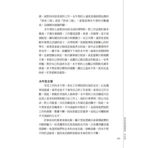 水牛型的人面對份內該完成的事物時,對工作品質的要求極高,不僅注重細節,工作態度認真、負責、有條理、從不虎頭蛇尾,擁有絕佳的自制力和實踐力。在公司裡,通常是老板眼中理想且忠誠的員工。在學校裡,是最能博取老師歡心的好學生。如果是家庭主婦或是家庭煮夫的話,家中必定整理得井然有序、一塵不染。很...