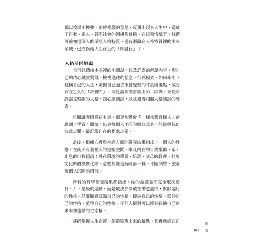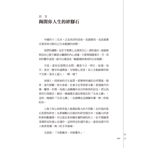 所有的科學研究結果都指出:你的命運並不完全取決於日、月、星辰的運轉,而是取決於深藏在你潛意識中,默默運行的性格。只要你願意認識自己的性格、接納自己的性格、延伸自己的性格、重塑自己的性格,任何人絕對可以擁有主宰權,彩繪自己的未來和遠景。