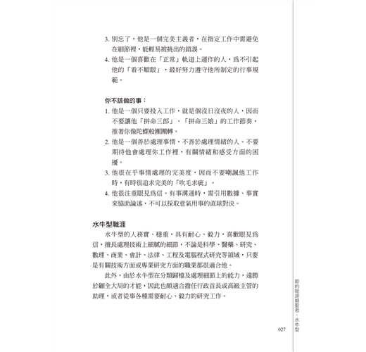 此外,由於水牛型在分類歸檔及處理小細節上的能力,遠勝於顧全大局的才能,因此也頗適合擔任行政首長或高級主管的助理,或者從事各種需要耐心、毅力的研究工作。