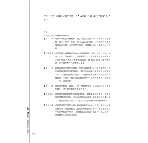 我們將用現代心理學中,評估人格型態的六大基本原則(自我、人際關係、工作、情緒、自我控制及人生哲學)(註),來分析每種人格典型,以及分析這六大領域間的相互運作,將如何引導你的人生。