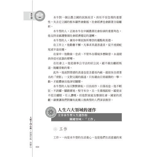 水牛型的人務實、穩重,具有耐心、毅力,喜歡眼見為信,擅長處理技術上細膩的細節,不論是科學、醫藥、研究、數理、商業、會計、法律、工程及電腦程式研究等領域,只要是有關技術方面或專業研究方面的 職業都很適合他。