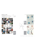 ① 輕微傾斜且不對齊的加大字體橫排於版面,不規則的造型由四張紙手工拼貼而成,整體體現了服裝由布料拼貼的特點。