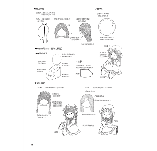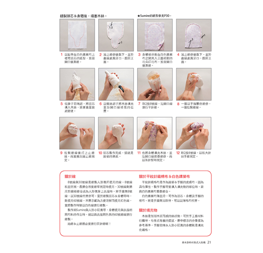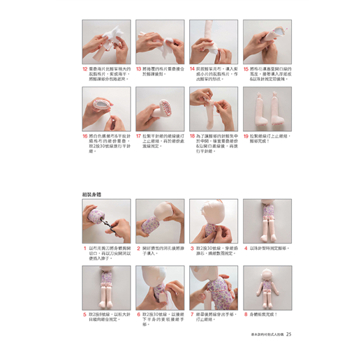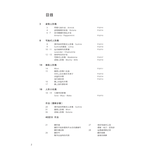 以此四種基本作法即可作出布置擺飾、陪伴娃娃、換裝娃娃等不同的類型,且針對不同作法皆以詳細的分解步驟圖進行示範解說;從人形偶主體的製作、充棉&身體組件的接連方式、頭髮造型&臉部表情呈現,到衣服的縫製&接縫皆有教作。請跟著作者的詳細解說&重點提點進行縫製,作出專屬於你的可愛人形偶吧!