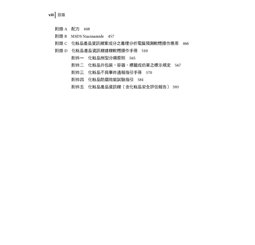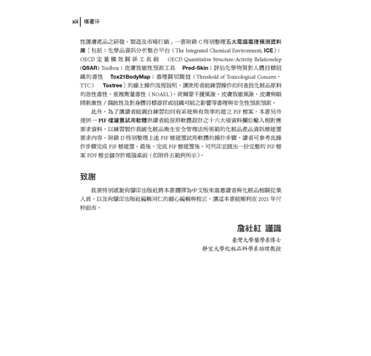 此外,為了讓讀者能親自練習如何有系統與有效率的建立PIF 檔案,本書另外提供一PIF 檔建置試用軟體供讀者能按照軟體設計之十六大項資料欄位輸入相對應要求資料,以練習製作我國化粧品衛生安全管理法所規範的化粧品產品資訊檔建置要求內容。附錄D 特別整理上述PIF 檔建置試用軟體的操作步驟,讀者可參考此操作步驟完成PIF 檔建置。最後,完成PIF 檔建置後,可列印並匯出一份完整的PIF 檔案PDF 檔並儲存於電腦桌面(如附件五範例所示)。