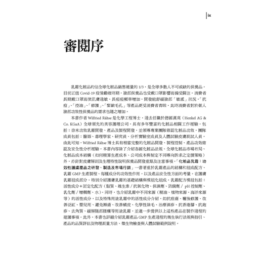 本書作者Wilfried Rähse 是化學工程博士,過去任職於德國漢高(Henkel AG &Co. KGaA)全球領先的美容護理公司,具有多年豐富的化粧品相關工作經驗,包括:奈米功效乳霜...