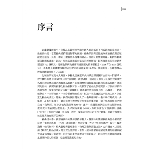 本書作者Wilfried Rähse 是化學工程博士,過去任職於德國漢高(Henkel AG &Co. KGaA)全球領先的美容護理公司,具有多年豐富的化粧品相關工作經驗,包括:奈米功效乳霜開發、產品及製程開發,並領導專業團隊確認化粧品功效,團隊成員包括:醫師、毒理學家、研究員、分析實驗室成員及人體試驗皮膚測試人員。由此可知,Wilfried Rähse 博士具有相當完整的化粧品開發、製程控制、產品功效確認及安全性分析經驗。本書內容除了介紹各國化粧品法規、全球化粧品市場布局、化粧品成本結構(如何精算生產成本、公司成本與制定不同導向訴求之定價策略)外,亦針對皮膚解剖及生理特性說明保養品開發重點及注意事項。「化粧品乳霜:功效性護膚產品之研發、製造及市場行銷」一書著重於乳霜產品的結構和組成配方、乳霜GMP 生產製程、每種成分的功效性作用,以及產品安全性方面的考量。在護膚乳霜組成部分,特別介紹護膚乳霜的基礎結構與模組化組成,乳霜配方模組包括:活性成分+固定化配方(脂質、維生素/抗氧化物、保濕劑、防腐劑/ pH 控制劑、乳化劑/增稠劑、水)。同時,也介紹乳霜中不同來源(精油、植物來源、海洋來源等)的活性成分,以及特殊用途乳霜中的活性成分介紹,如抗痤瘡、曬後修護、改善泛紅、嬰兒用、避免褥瘡、改善橘皮、化學性除毛、治療濕疹、抗香港腳、抗皰疹、去角質、緩解腿部搔癢等用途乳霜,並進一步提供以上這些產品在製作過程的建議事項。此外,本書也詳細介紹乳霜產品GMP 生產過程的衛生執行法規與指引、產品的品質評估及物理測量方法、微生物檢查與人體試驗範例說明。