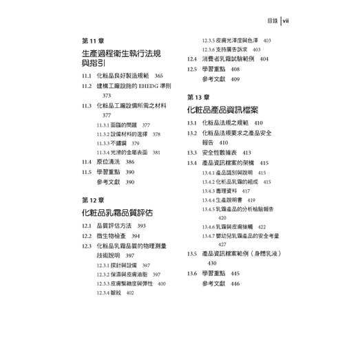 基於世界各國化粧品法規對於化粧品安全性的要求與消費者健康意識高漲,本書第十三章亦提供詳細的化粧品產品資訊檔案(PIF)建置架構說明、化粧品原料毒理資料的準備方法、乳霜產品的GMP 生產說明書、產品品質分析檢驗報告,也特別說明研發嬰幼兒乳霜產品應有的安全考量為何?以及提供身體乳液的產品資訊檔案建置範例供讀者建置PIF 檔案參考。