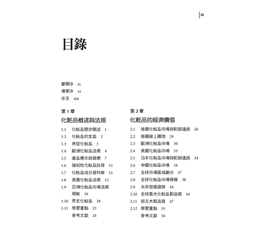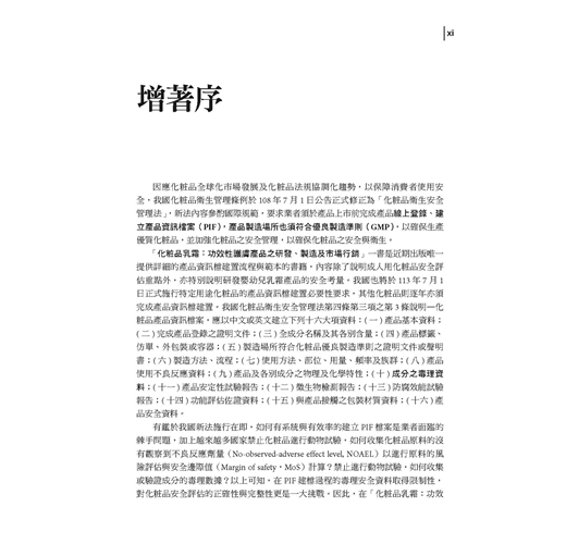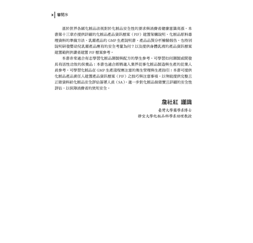 本書非常適合有志學習化粧品調製與配方的學生參考,可學習如何調製或開發具有活性功效的保養品;本書也適合即將進入業界從事化粧品製造與生產的從業人員參考,可學習化粧品在GMP 生產過程應注意的衛生管理與生產指引;本書可提供化粧品產品責任人建置產品資訊檔案(PIF)之技巧與注意事項,以俾能提供完整且正確資料給化粧品安全評估簽署人員(SA),進一步對化粧品做確實且詳細的安全性評估,以保障消費者的使用安全。