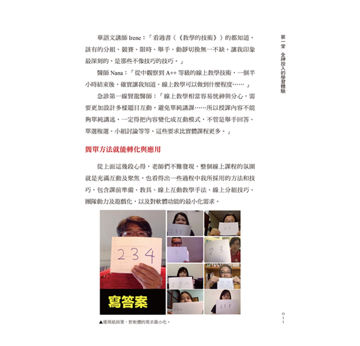 ★豐富的實務分享。作者在短時間內,累積近十場、破千人參與的線上示範教學,從12人到353人的大小場次,運用過Webex、Meet、Team、Zoom各種不同軟體,公開分享都能順利操作的實用技巧。