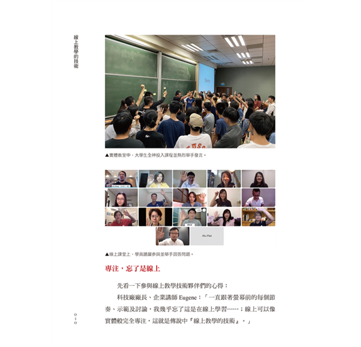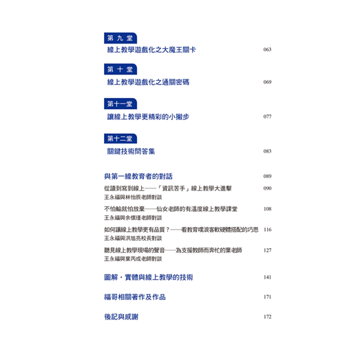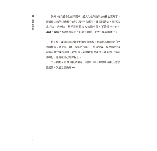 疫情期間,全國教師的最大挑戰無非就是如何從實體轉為線上教學。幸運的是,我先前就有實體和線上教學的經驗,也早就在上課時應用了福哥「教學的技術」,所以除了適應不同軟體更換的過程之外,並沒有遇上其他的困難。但是,不論心法或技法,福哥的《線上教學的技術》都再一次給了我更多的體會,如果你還是線上教學的新手,一定可以藉由這本書得到福哥更多的幫助。