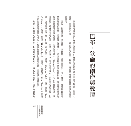 巴布.狄倫以詩、以詞曲、以歌聲、以樂器創作,引人矚目,獲得無數音樂獎項與普立茲獎、諾貝爾文學獎。一直以來我不熟悉他的歌曲,倒是很喜愛以他為內在靈魂所創造的電影《搖滾啟示錄》(I’m Not There)。六人分飾的角色,不同年齡不同膚色不同名字,是黑人是白人,是小孩是成人,卻都是代表巴布.狄倫,也可說不是巴布.狄倫。克里斯汀.貝爾(Christian Bale)、班.維蕭(Ben Whishaw)、希斯.萊傑(Heath Ledger)、凱特.布蘭琪(Cate Blanchett)等幾位知名演員所飾演的角色,都具有類似狄倫的樣貌、言談與生命歷程。