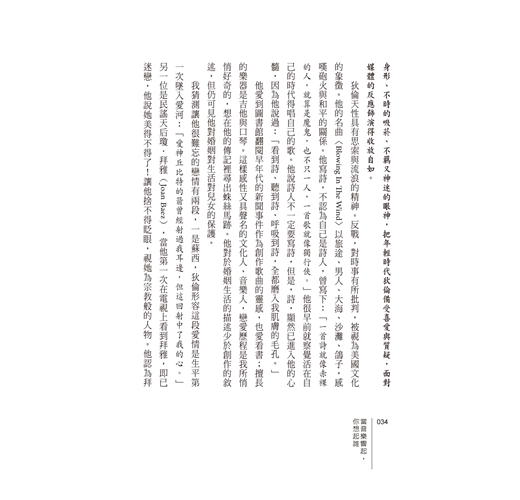 他愛到圖書館翻閱早年代的新聞事件作為創作歌曲的靈感,也愛看書;擅長的樂器是吉他與口琴。這樣感性又具聲名的文化人、音樂人,戀愛歷程是我所悄悄好奇的,想在他的傳記裡尋出蛛絲馬跡。他對於婚姻生活的描述少於創作的敘述,但仍可見他對婚姻對生活對兒女的保護。