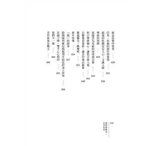 七個音階譜成唱不盡的悲歡離合、酸甜苦辣的人性基調。打開孟樵的新書,每一個筆下的人事情境,交織著一首首流行樂、搖滾、交響曲、爵士等等不同的音樂,那些文字彷如音符流瀉,看了挑動心弦。