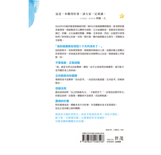 本書講述了作者從肺癌第4B 期到奇跡般生還的實錄,同時也講述了他通過這次的經歷瞭解到的在生活中創造奇跡的法則。