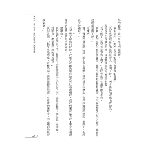 儘管如此,作者還是堅信自己「一定會痊癒」。為了治癒癌症,作者翻遍各種書籍,求助了許多名醫,最後拒絕了原本醫生建議的抗癌藥物治療,並嘗試了包括完全糙米素食、斷鹽斷糖、中醫、自強法、陶板浴、替代醫學、民間療法、奇門遁甲等各種能想到的治療方法。
