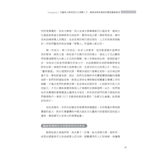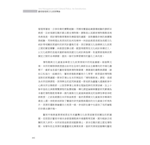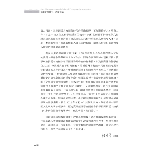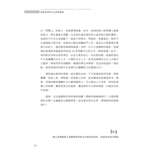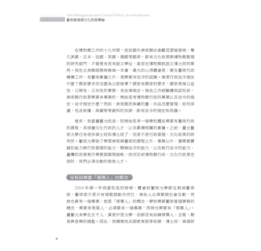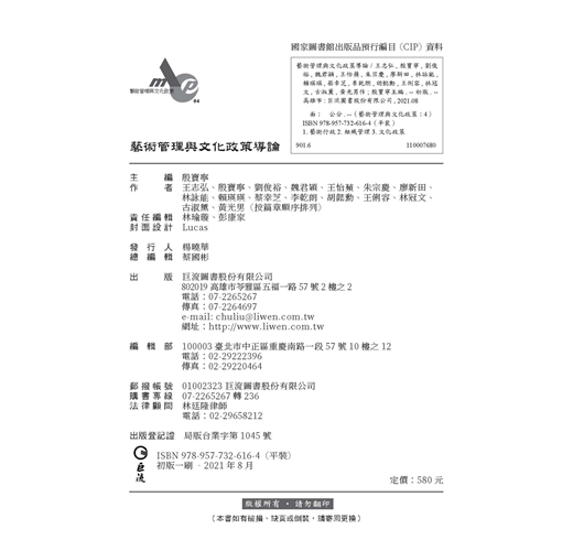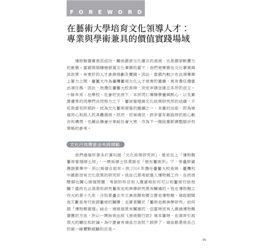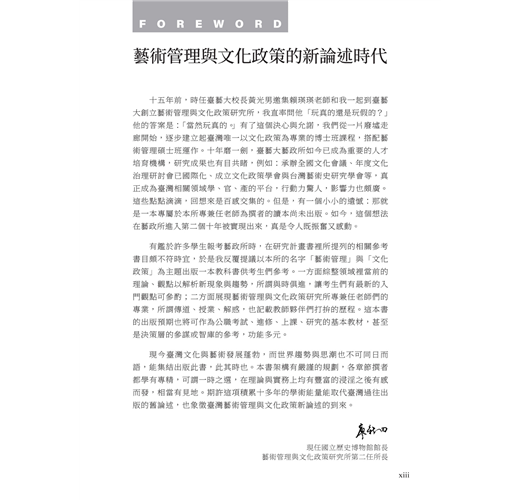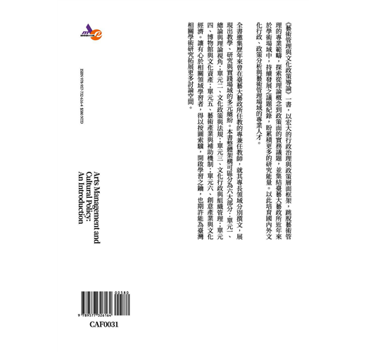 《藝術管理與文化政策導論》一書,以宏大的行政治理與政策層面框架,跳脫藝術管理的專業範疇,探索從理論概念到政策面的實務議題,並集結臺藝大藝政所近年來於學術場域中,持續發展之議題紀錄,盼累積更多的研究能量。以此培育國內外文化行政、政策分析與藝術管理場域的專業人才。