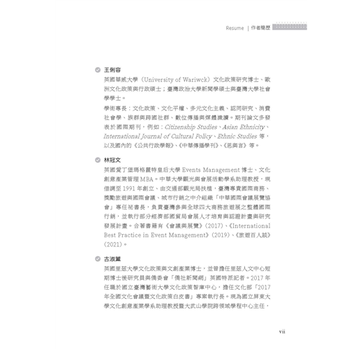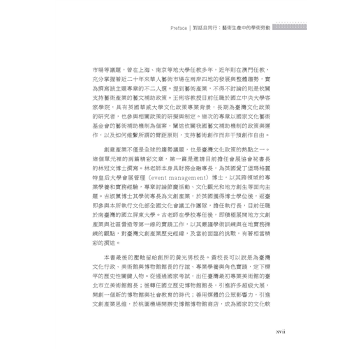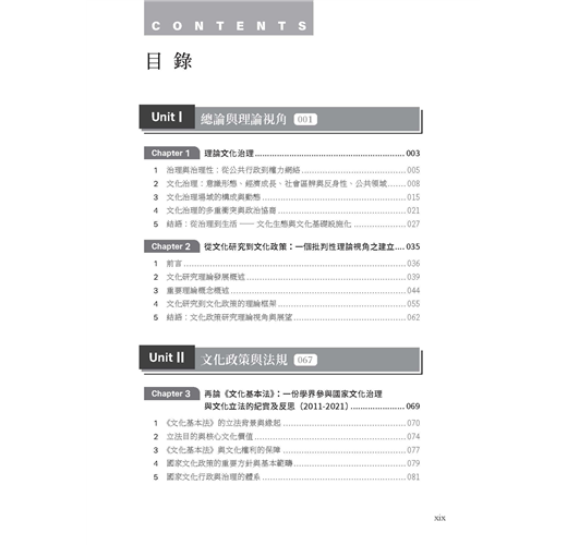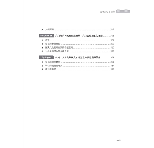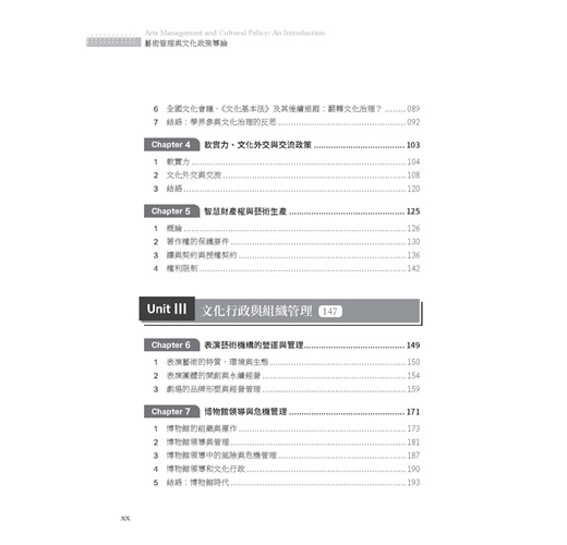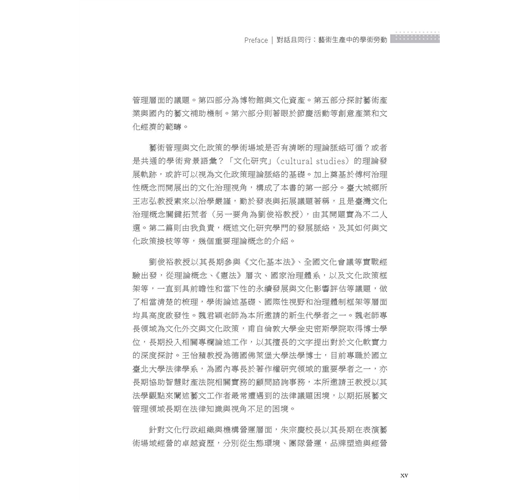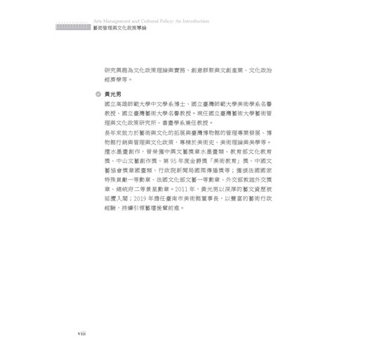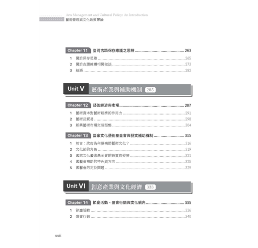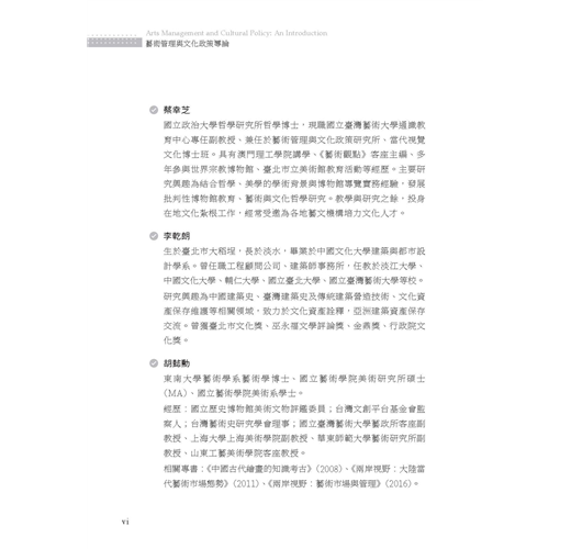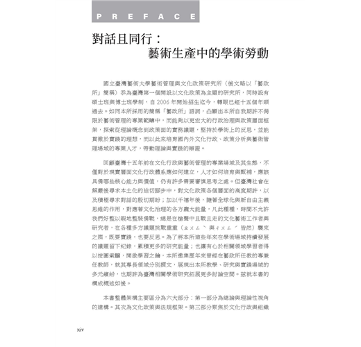 全書邀集歷年來曾在臺藝大藝政所任教的專兼任教師,就其專長領域分別撰文,展現出教學、研究與實踐場域的多元繽紛。本書整體架構可區分為六大部分: