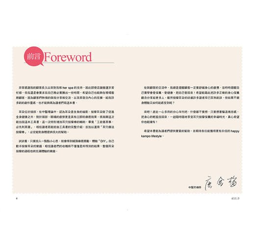 由於自身對漢方充滿興趣,因而將對漢方的熱愛轉而運用於SPA領域中,例如,將「耳穴療法(Ear Acupoint Therapy)」結合漢方,設計成為一門專業的耳朵SPA 保養課程,並深入研究與推廣,深受年輕顧客喜愛。著有《最快速、最有效!捏耳排毒法》、《零基礎學漢方芳療》等書。