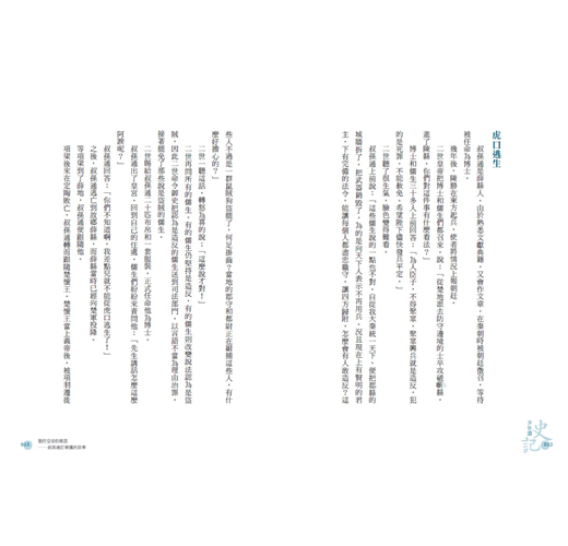 ●原典精選: 呈現與人物故事相關的原典片段,附上詳盡的語譯和簡要的注釋, 藉此管窺全豹,提升古文的閱讀能力,亦可作為教學之用。