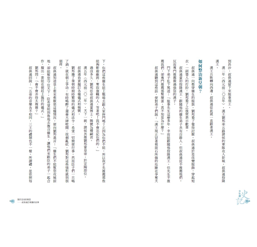 太史公司馬遷在《史記》中記載的事蹟,不僅僅是故事,更是歷史中的「生命檔案」。希望藉由這些歷史人物的風範,少年讀者能對生命有更多理解,開闊眼界!