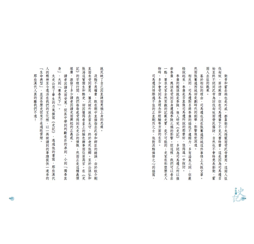 《史記》雖然是一部歷史書,但司馬遷是以記傳體形式書寫,他在下筆寫歷史的同時,也讓我們了解了當時人物的情性、他們心中的價值觀、以及時代對他們的評價。因此閱讀《史記》,不見得要將它當作史書,也可以把它當作很好看的小說欣賞、咀嚼、回味,因為它根本就是一部最好的文學作品。而我們現今所知的許多典故,也都出自《史記》,閱讀《史記》,是增進國學知識不可或缺的一把鑰匙。