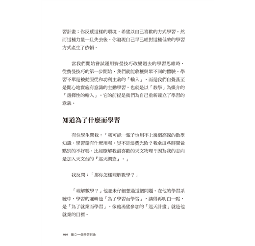 我在書中強調的重點是,學習和應用是互為一體的,無法對外輸出的學習就不能稱為學習。這是我對自己的學生、讀者和年輕人的期許;閱讀本書,學習費曼的思路,是要讓我們擁出色的應用知識的能力,能夠運用知識,創造知識,並用知識改造世界。