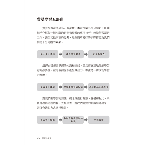 通過這五個步驟,我們很容易便能有更深入的理解,加強學習的效果,讓自己順利地達到學習和運用知識的目的。在本書中,我們圍繞費曼的學習思想和他的教學經驗,對這五個步驟的要點、原則和應用的場景進行了全方位的解讀。