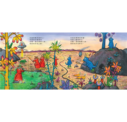 作者茱莉亞.唐納森是位韻文大師,她擅長結合不同的單字、聲韻,為每本故事創造出獨一無二的語言。這些獨創的字詞看似無稽,但若讀者能念出聲來,並慢下來思考,就能發現這些「原創詞」是有巧思在的,隱藏著作者想要傳達的意象。「潑波露露湖」、「抓抓摳摳樹」、「凍凍果」給人什麼樣的感覺呢?家長不妨與孩子們一起發揮想像力,分享自己的感受!