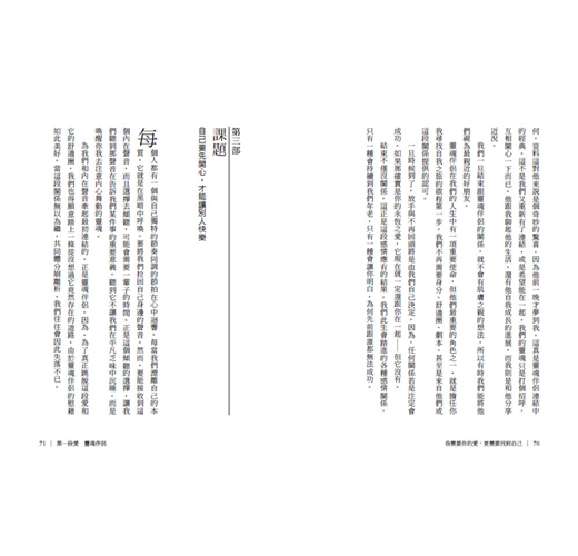 這是一段我們將跟某人攜手共度,而且就是適合我們的愛――在當中,個人行為既沒有典範與期許需要追隨,更沒有需要成為另一個人的壓力。我們以自己此時已是的狀態而被對方接受──這令我們為之震撼。在此之前,我們不斷在愛裡掙扎,企圖讓愛來滿足我們,或是希望它能成功。所以這段全然輕鬆、毫不費力的感情反而讓我們覺得膽怯不安。這時要知道,世上確實有無需費心爭取的愛,它甚至無需你開口要求。