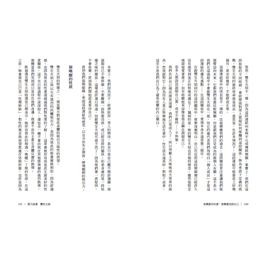 這段關係終究不是只為了停駐在每個夜裡都有人能與你相擁入眠,它的存在是為了讓你我更接近我們生來就該成為的那個「更好的自己」。它是一段會帶領我們回歸自我本質的感情,儘管方法有時極具挑戰性;它也是一段無價的關係,因為無人能做到我們的雙生火焰能為我們做的事。這不僅是一段將不求回報的愛延伸至伴侶的歷程,也是將這份愛延伸到我們自已和身邊的人的歷程;這不僅要能真實感受到愛的情緒,還要成為一種律動。