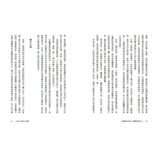 我在自己的第二段愛情裡過度樂觀太久。我太希望這段感情能依我設定的故事情節發展,因而忽略了現實,也因此願意保持沉默。畢竟與自己熟識的惡魔相處,要比冒著風險去探尋真正的快樂是何等樣貌來得容易。在這個階段的感情中,我們還在尋求自身之外的快樂。我們認為問題就出在這段關係,而我們能去修補它,卻不願認清所有的不愉快其實全都源於自己的不快樂與選擇。