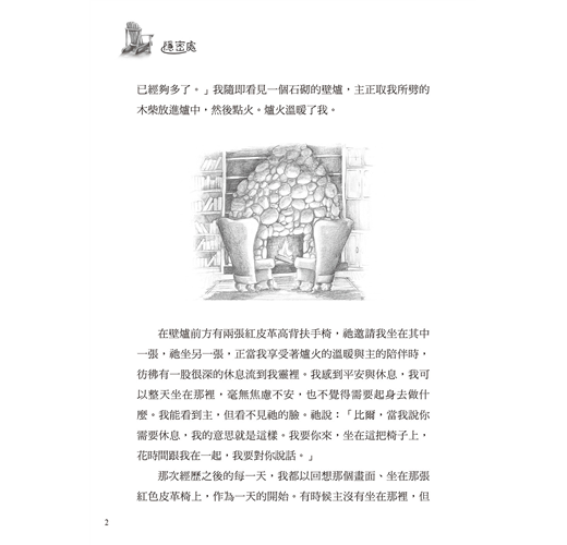 在壁爐前方有兩張紅皮革高背扶手椅,祂邀請我坐在其中一張,祂坐另一張,正當我享受著爐火的溫暖與主的陪伴時,彷彿有一股很深的休息流到我靈裡。我感到平安與休息,我可以整天坐在那裡,毫無焦慮不安,也不覺得需要起身去做什麼。我能看到主,但看不見祂的臉。祂說:「比爾,當我說你需要休息,我的意思就是這樣。我要你來,坐在這把椅子上,花時間跟我在一起,我要對你說話。」