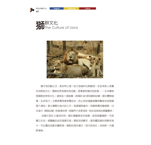獅子為百獸之王,是世界上唯一的大型貓科社群動物,史瓦帝族人承襲非洲原始文化,獅群的特有習性與活動,是學習和模仿的對象,一夫多妻制是獅群的特有...